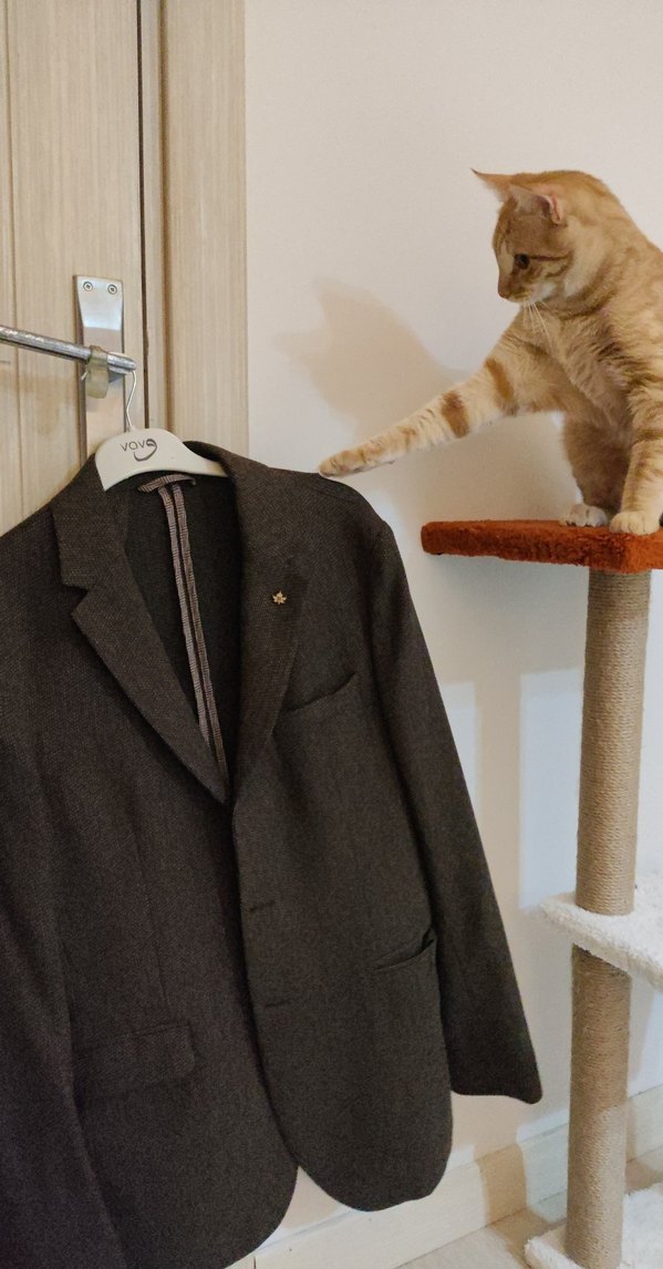 Kahverengi erkek ceket, düğmeli ve normal kesim. Uzun kollu, klasik şıklık ve iş ortamı için uygun. Kumaşı ince. Az kullanıldı