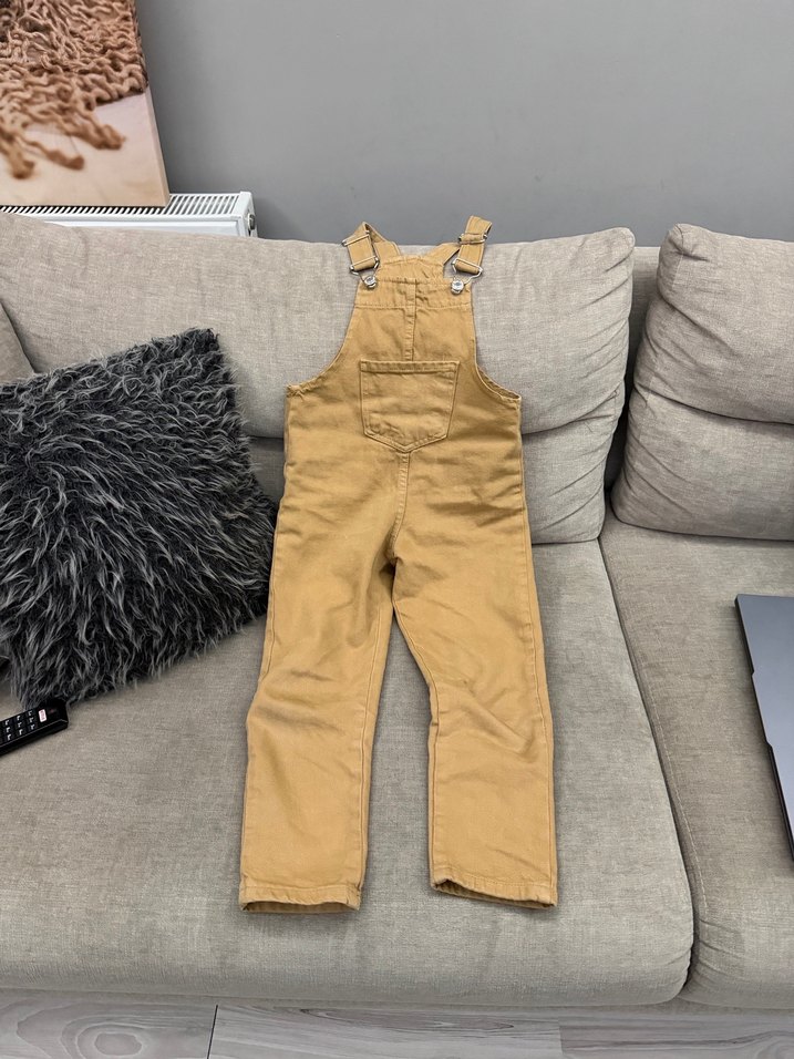 Kahverengi kot kumaştan, askılı, ön cepli, tokalı bantlı bol kesim erkek çocuk tulumu.