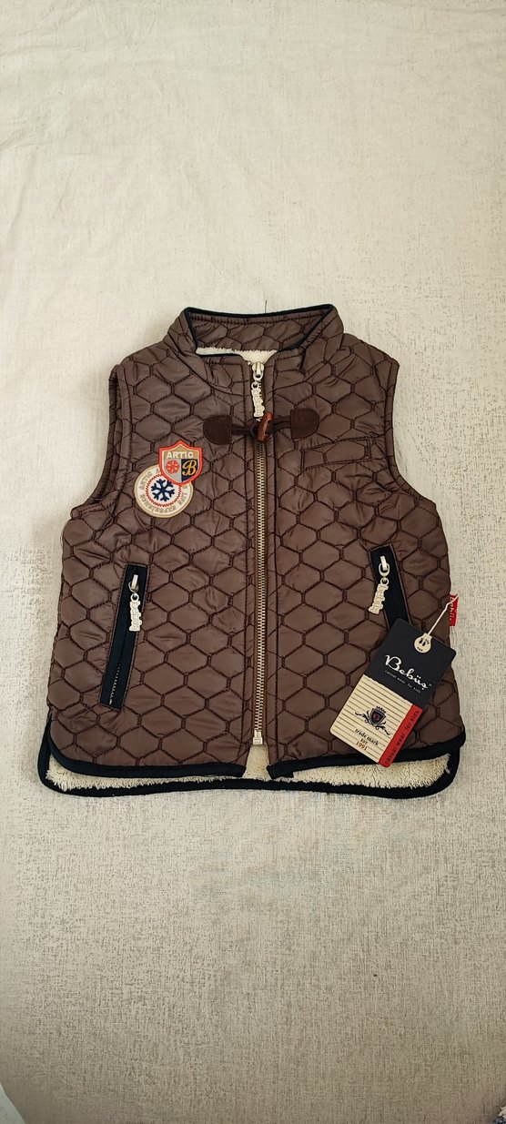 Kahverengi, bisikletçi tarzı, kolsuz erkek çocuk yeleği, nakışlı ve kemerli. Yumuşak ve sıcak kumaştan, fermuarlı cepler içerir.