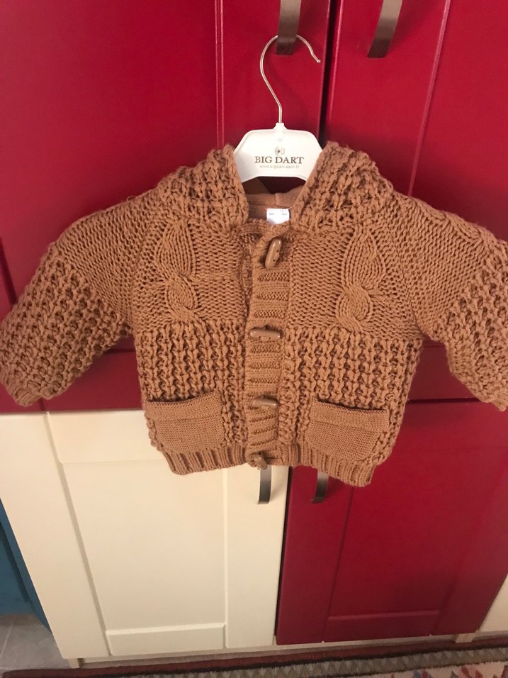 Bu kahverengi bohem tarzı, uzun kollu ve fitted kesim erkek çocuk hırka örgü dokusuna sahiptir. Önünde iki cep bulunur.