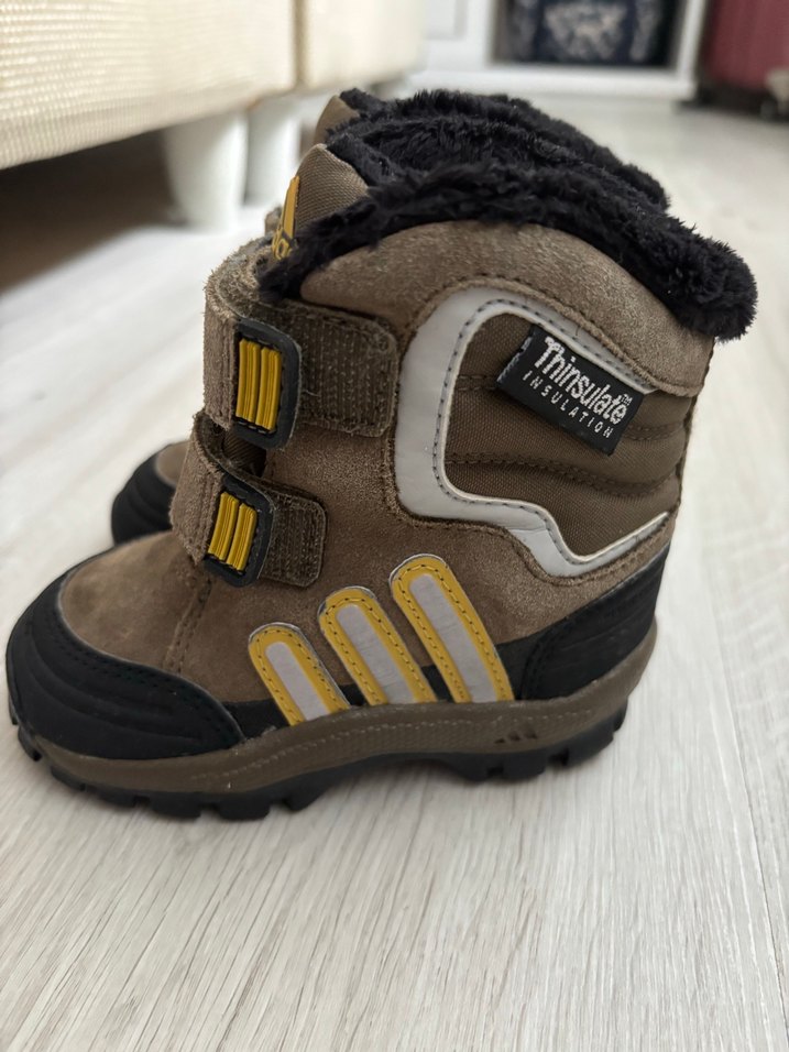 Kahverengi erkek çocuk botu, Velcro bantlı ve baskılı detaylı, yumuşak ve sıcak astarlı rahat tasarım. Sokak stili için uygundur.