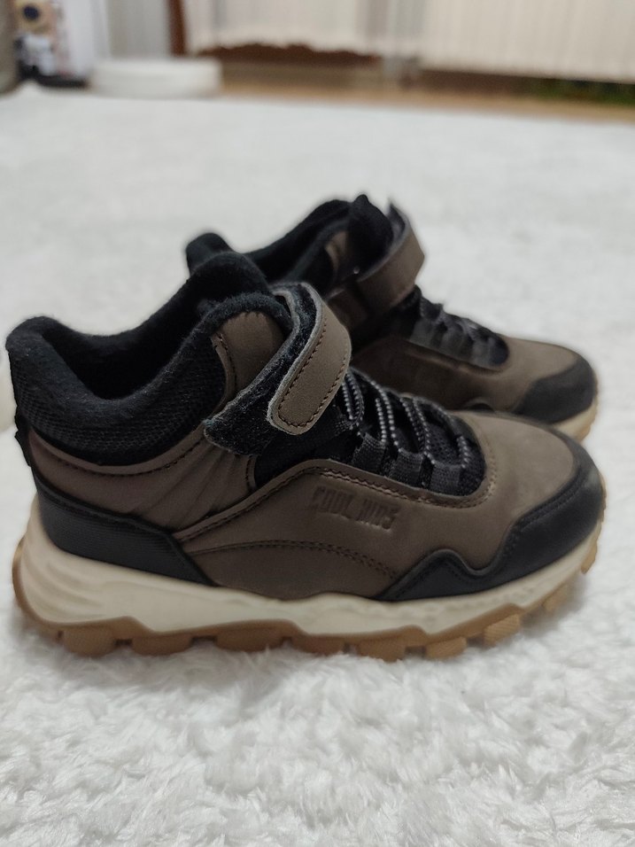 Kahverengi, gri ve siyah renklerde, lastik tabanlı erkek çocuk botu. Velcro bantlı, sokak tarzına uygun rahat model. tertemiz 4-5 kez anca kullanılmıştır
