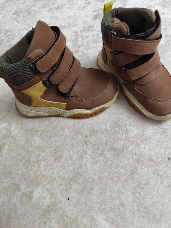 Kahverengi kauçuk erkek çocuk botları, cırt cırtlı bantlara sahip, gri yastıklı bilek kısmıyla sokak stiline uygun. Rahat ve kolay giyilir. hiç giyilmedi