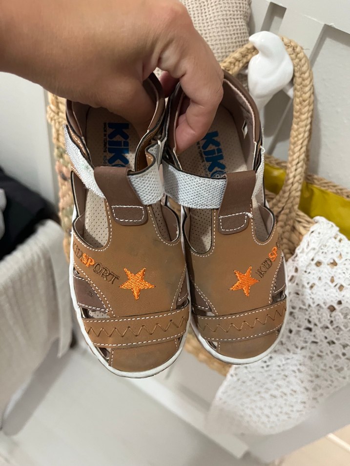 Açık kahverengi, baskılı desenli, cırt cırtlı erkek çocuk sokak stili spor terlikler. Dayanıklı kauçuk malzemeden üretilmiştir.