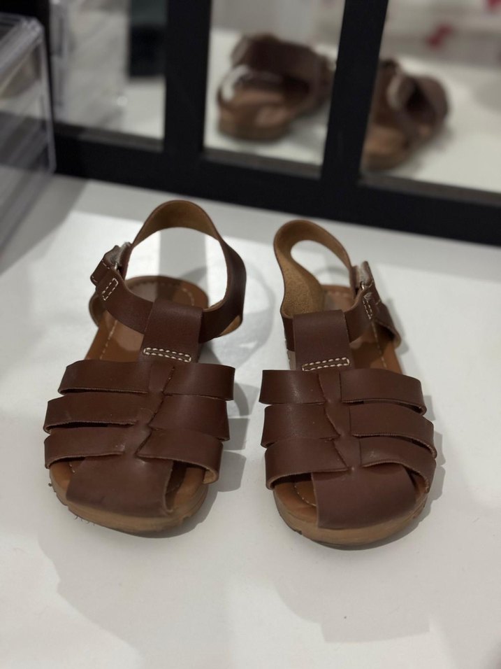 Kahverengi deri erkek çocuk sandaletleri, tokalı kayış ve sade, klasik tasarıma sahiptir. Rahat kullanım sunar, desensiz ve koyu renklidir.