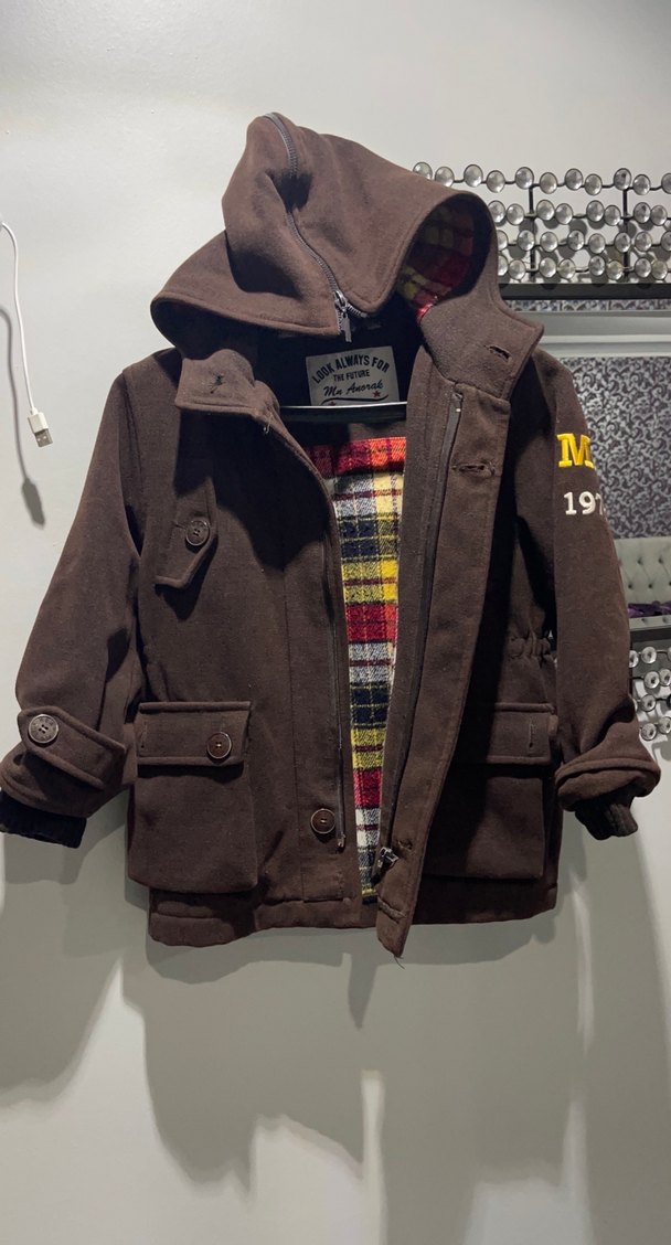 Kahverengi erkek çocuk düğmeli kaban, notched lapel yakalı ve baskılı iç astarlı. Yumuşak ve sıcak kumaştan, regular fit kesime sahip. Kollarda '19' baskısı bulunur. Fermuarı bozuk düğmeleri var engel değil