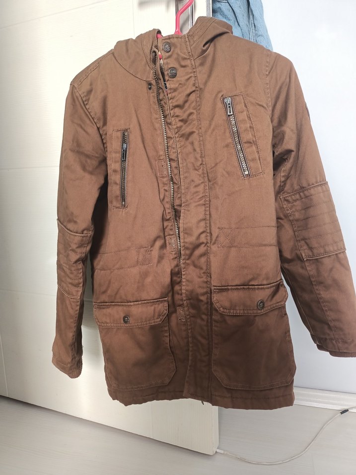Koyu kahverengi keten kumaştan, düğmeli, notched lapel yakalı, cep detaylı erkek çocuk ceketi. Street wear tarzında, dar kesim.