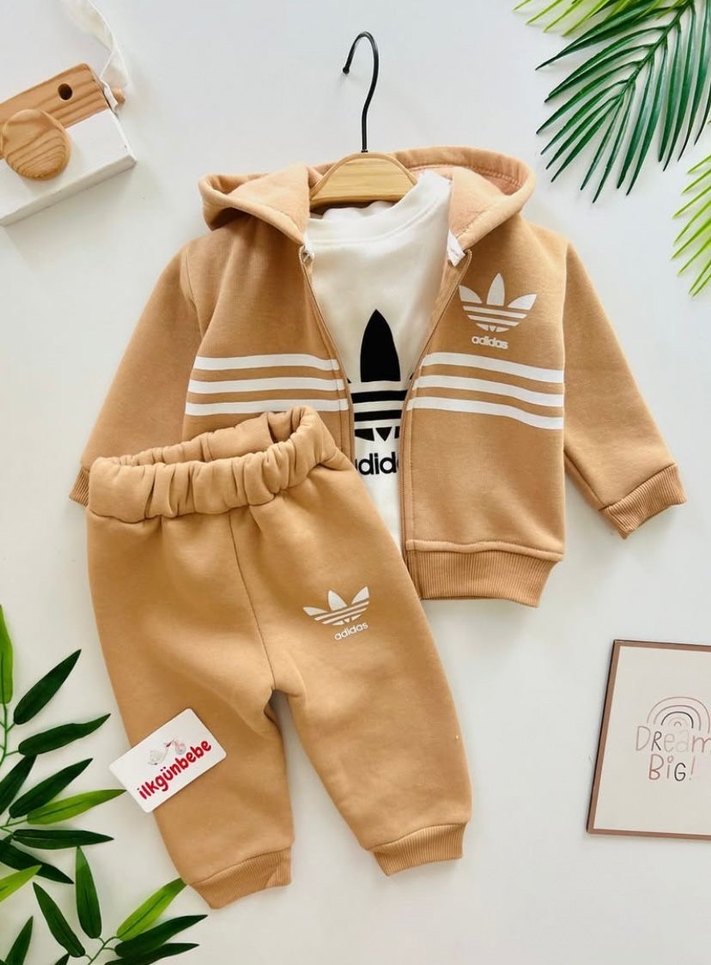 Kahverengi, yumuşak ve sıcak kumaştan erkek çocuk eşofman takımı. Kapüşonlu ceket ve beyaz çizgili pantolon, rahat ve şık bir görünüm sunar. Crew neck yakalıdır.3 ip şardonlu 6-9 9-12 12-18 18-24 ay