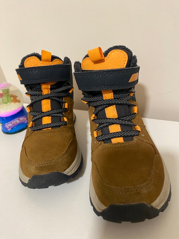 Kahverengi kauçuk malzemeden yapılmış, cırt cırtlı ve bağcıklı, trend erkek çocuk su geçirmez kar botu. Bi kaç defa giyildi temiz sorunsuz