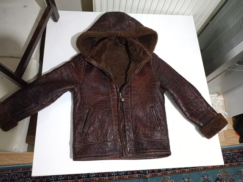 199- Kahverengi, kürklü astarlı ve kapüşonlu erkek çocuk deri ceketi. Notch yaka ve biker tarzında, düz dokulu ve ön ceplidir.