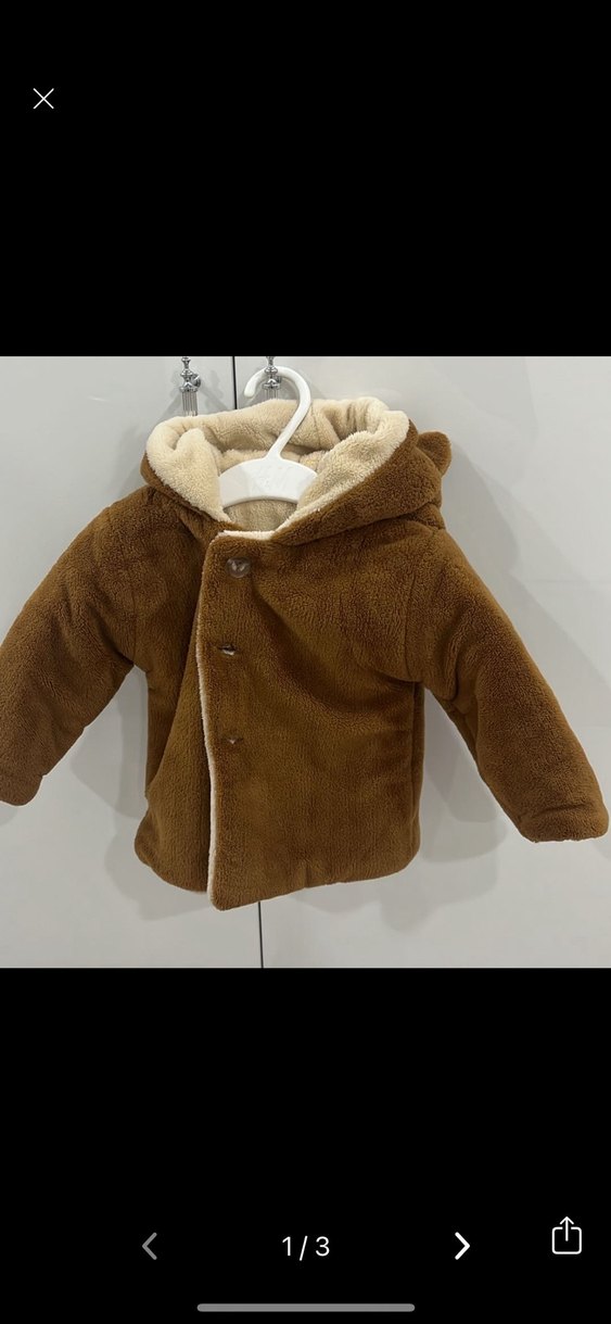 Kahverengi, bol kesim erkek çocuk montu, kürk detaylı ve yakası kesimli. Yumuşak ve sıcak kumaştan, sokak stili için uygun. Sadece bir kere giydirdik. Şuan küçük olduğu için giyemiyor. Alındığı gibi duruyor hiçbir problemi yok 9-12 ay bedenlidir