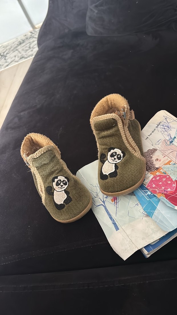 Yumuşak kürk görünümlü kahverengi erkek çocuk terlikleri, nakışlı pandalı desen ve fermuar kapanış ile sıcak tutar.