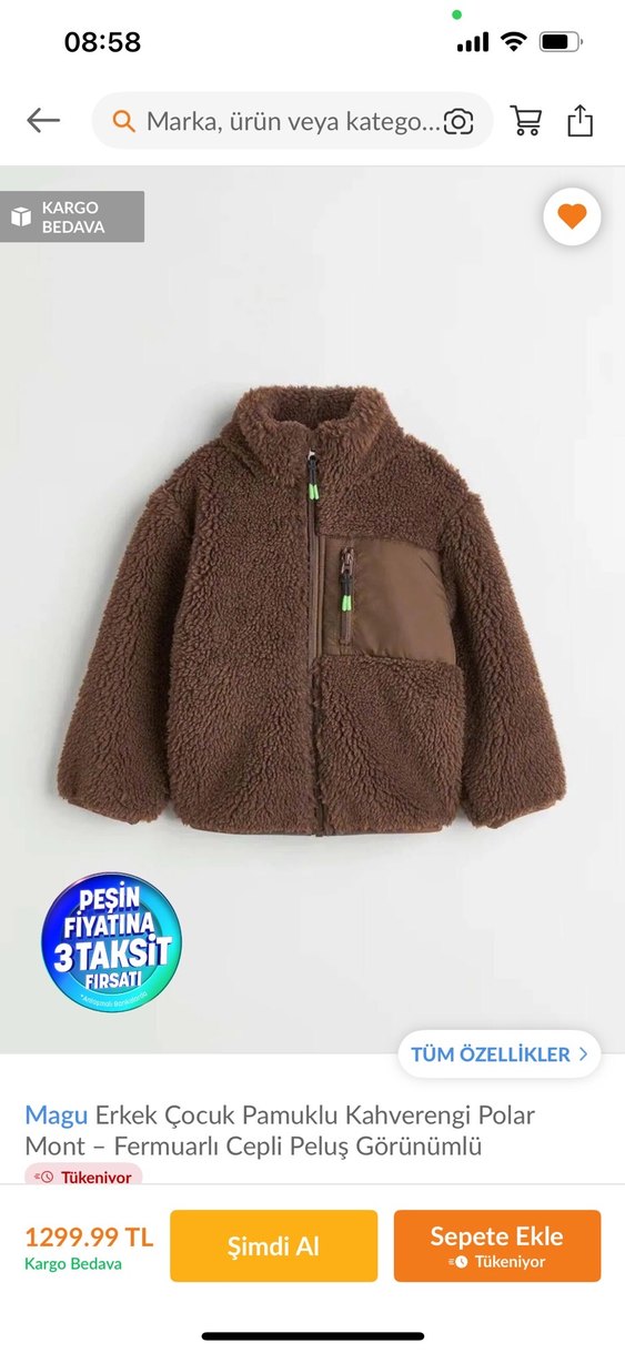 Kahverengi, peluş kumaştan, bol kesim erkek çocuk ceket. Düz renk, kürklü detaylı, bisiklet yaka ve göğüs cep fermuarlı. Severek giymediği için satıyorum ürün yenidir çok az kulllanıldı fiyatta yardımcı olacağım