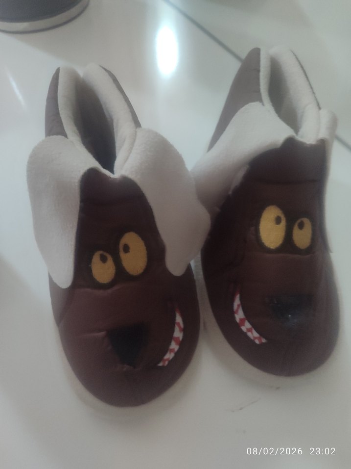 Koyu kahverengi, nakışlı göz detaylı ve cırt cırtlı erkek çocuk sıcak terliği, yumuşak ve sıcak kumaştan üretilmiştir.
