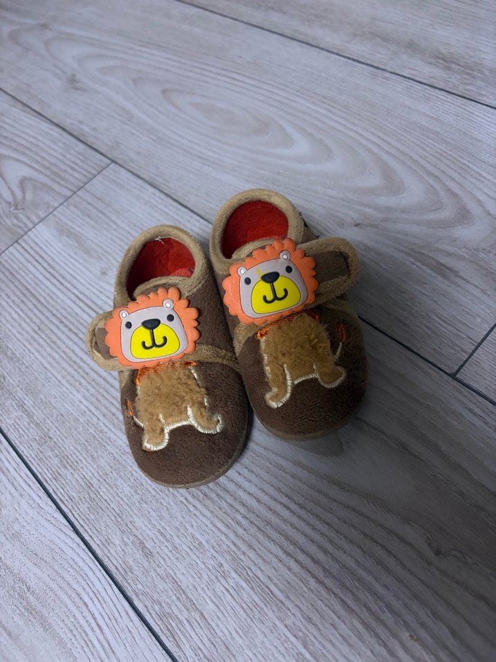 Sadece 1 ay kullandık. Tertemiz, defosu yok. Kahverengi, renkli aslan detaylı, cırt cırtlı, yumuşak ve sıcak kumaştan erkek çocuk ev terliği.