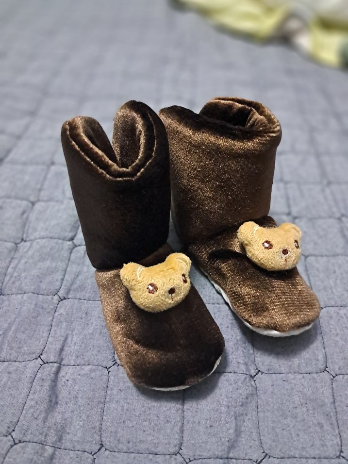Yumuşak ve sıcak kumaştan yapılmış, kahverengi erkek çocuk ev terliği. Kürklü detaylar ve renkli işlemeli ayıcık figürleri bulunur. Geleneksel tarzda. 15 SANTİM