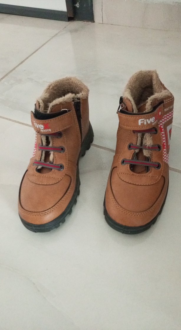Kahverengi, renkli baskılı detaylara sahip erkek çocuk botları. Cırt cırtlı ve sıcak astarlı, sokak stili için uygun