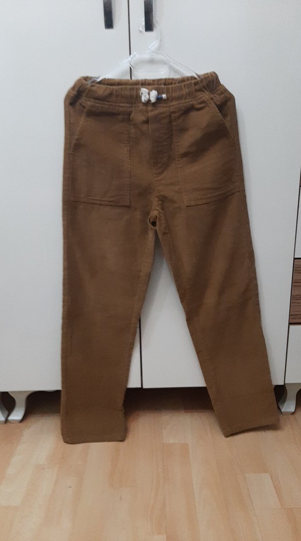 Kahverengi süet fitilli kumaştan, bel detaylı, düz ve rahat kesimli erkek çocuk pantolonu, sokak modası tarzında.hiç kullanılmadı beli lastikli