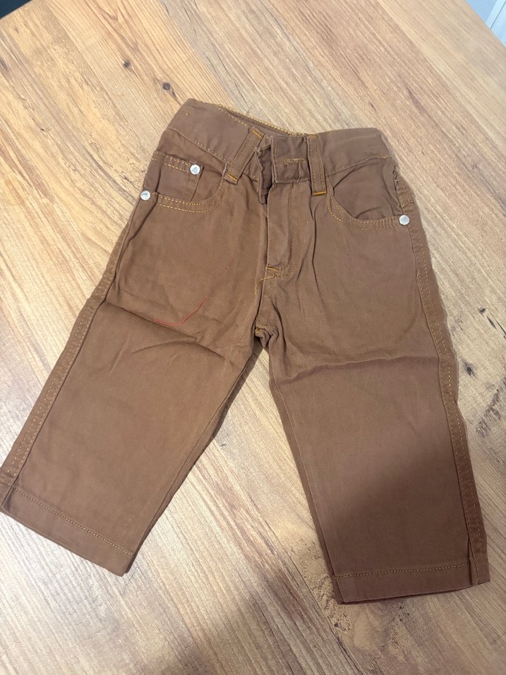 Kahverengi süet kumaştan erkek çocuk pantolonu, düz kesim ve kemerli tasarıma sahiptir. Parlak dokusu sokak stiline uygundur.