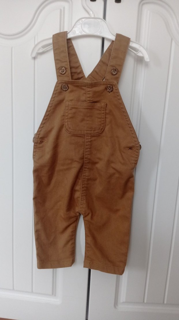 Yumuşak süet malzemeden yapılmış, kahverengi erkek çocuk tulumu. Tokalı askıları ve rahat kesimiyle sokak stiline uygun. Ön cepli ve desensiz.