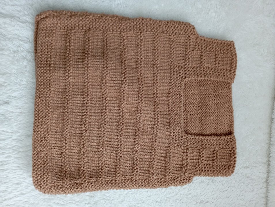 kahve renginde, örme dokulu, kolsuz, boğazlı ve normal kesim erkek çocuk süveter. Rahat kullanım için yumuşak triko iple örülmüştür 1-2 yaş için uygundur