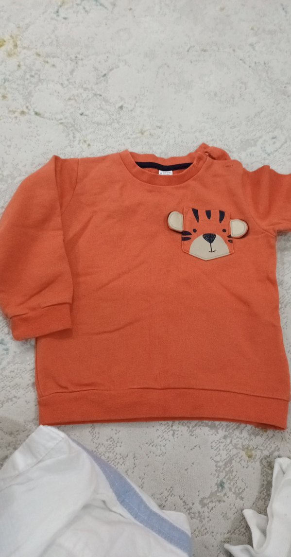 Uzun kollu, yuvarlak yaka ve bol kesim kahverengi erkek çocuk sweatshirt. Renkli baskılı kaplan yüzü cepli ve kürklü detaylı.