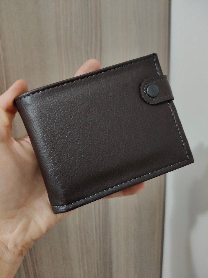 Çıtçıtlı, düz kahverengi erkek cüzdanı. Günlük kullanım tarzına uygun, sade ve kullanışlıdır.