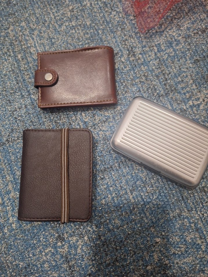 Yumuşak malzemeden iki kahverengi erkek cüzdanı, biri çıtçıtlı diğeri lastikli, yanında gri alüminyum kartlık içerir. cüzdanın yanindakiler hediyedir