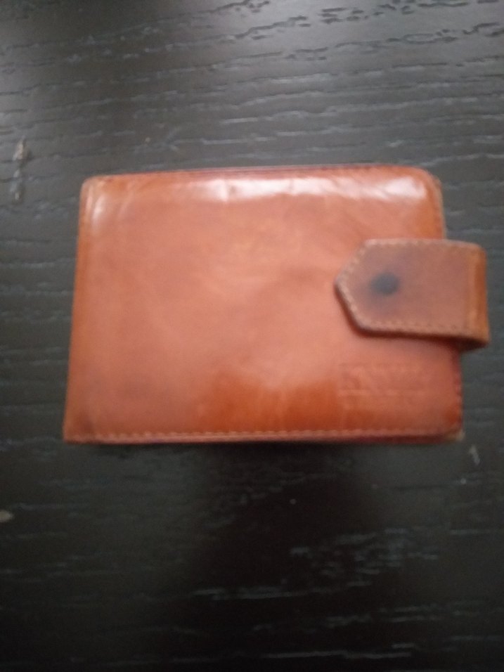 Kahverengi parlak, desen içermeyen erkek cüzdanı, çıtçıtlı kapama ile. Minimalist ve eski tarz bir görünüm sunar.