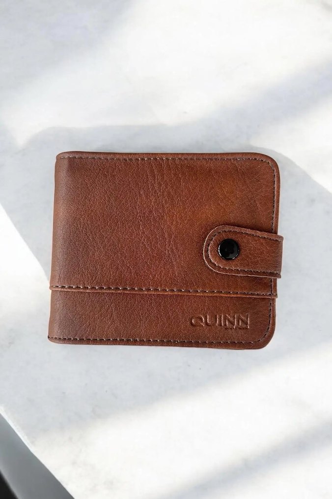 Parlak kahverengi erkek cüzdanı, düğmeli kapama ve sade desensiz tasarıma sahip. Minimalist ve küçük kabartma logo bulunur.