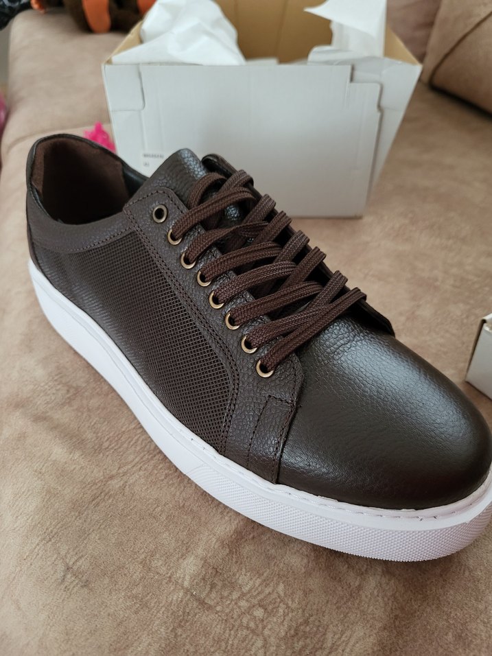 Koyu kahverengi erkek deri bağcıklı günlük ayakkabı, beyaz tabanlı sokak stili ve athleisure görünümüne uygun.