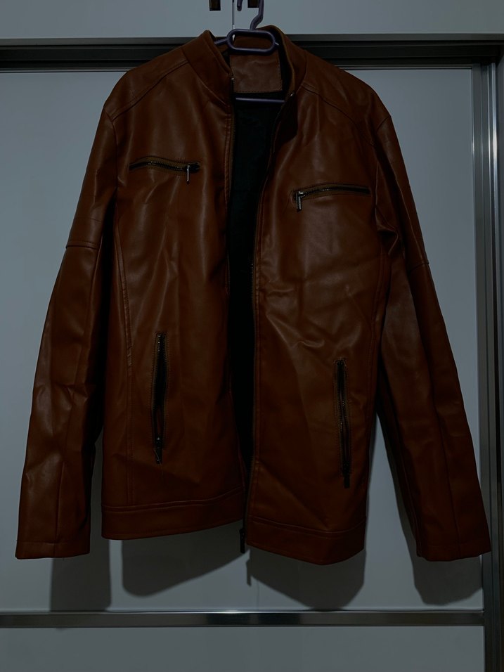 Kahverengi deri biker ceket, kesilmiş yaka, uzun kollu ve kemerli tasarıma sahiptir. Normal boy ve düzenli kesim ile günlük kullanıma uygundur.