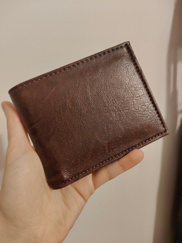 Yumuşak deri malzemeden yapılmış koyu kahverengi erkek cüzdanı, minimalist ve bohem tarzda, desensiz tasarıma sahiptir.