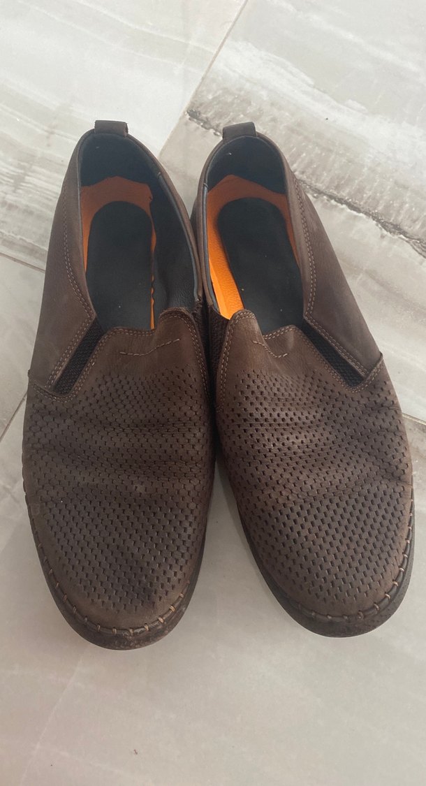 Koyu kahverengi erkek deri terlik, tokalı ve nefes alabilir delikli tasarıma sahiptir. Minimalist sokak stiline uygundur.
