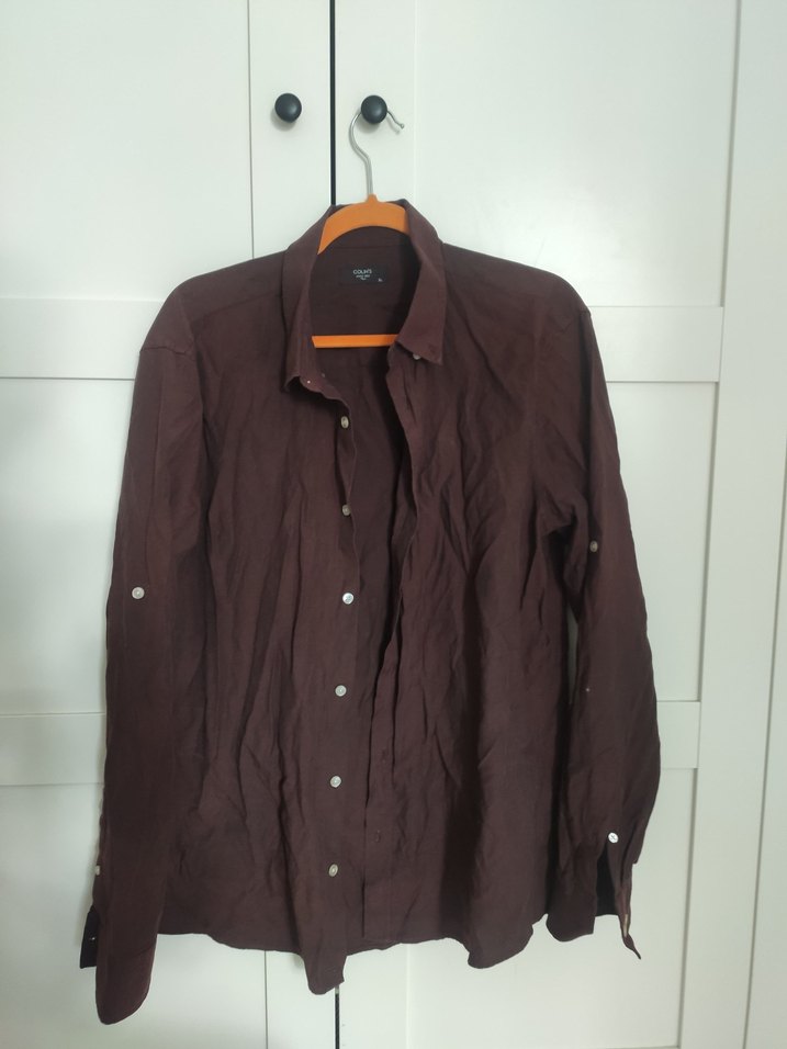 Kahverengi renkte, düğmeli ve kumaştan yapılmış erkek gömleği. Uzun kollu, rahat kesim ve günlük sokak stili için uygundur.