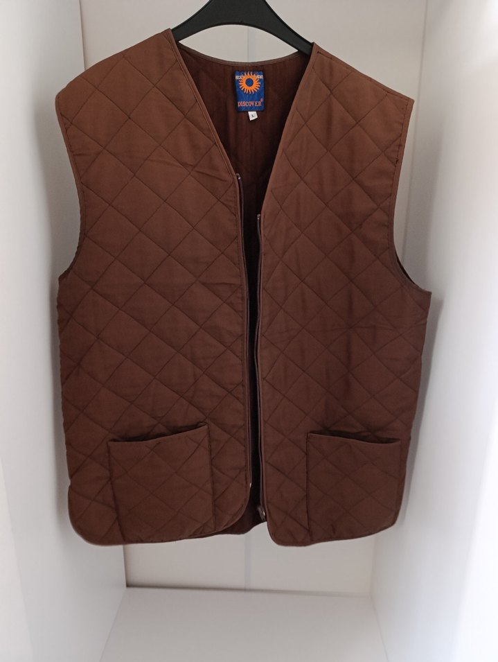 Kahverengi kapitone desende yelek. Normal boyda, cepli, regular fit ve yumuşak dokulu kumaştan üretilmiştir.