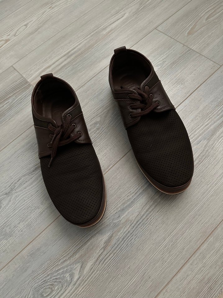 Kahverengi, tokalı erkek klasik ayakkabılar. Minimalist tarzda, günlük kullanım için uygun, rahat kauçuk tabanlı.