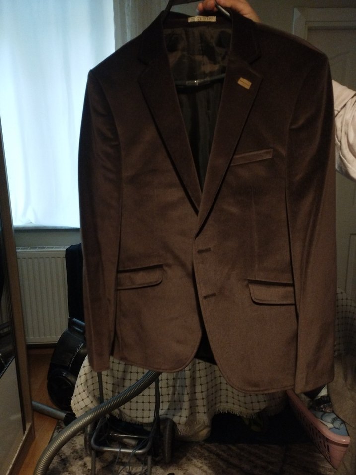 Kahverengi erkek ofis takım elbise ceketi, kesik yakalı ve düğmeli ön yapıya sahiptir. Uzun kollu, normal boyda ve klasik modern iş tarzına uygundur. Desensiz ve klasik şıklık sunar.