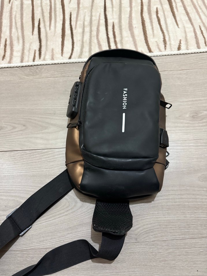 Koyu kahverengi, baskılı ve tokalı erkek omuz çantası, trend sokak stili için uygundur. Ön yüzünde "FASHION" yazısı bulunur. USB şarjlı ve şifreli kilitli