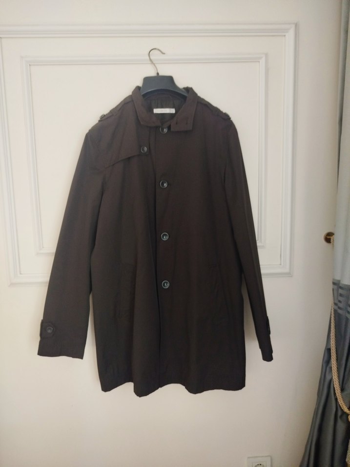 Düğmeli, kahverengi erkek midi kaban, normal kesim ve uzun kolludur. Minimalist sokak stiliyle günlük kullanıma uygundur. Sentetik kumaştan üretilmiştir.