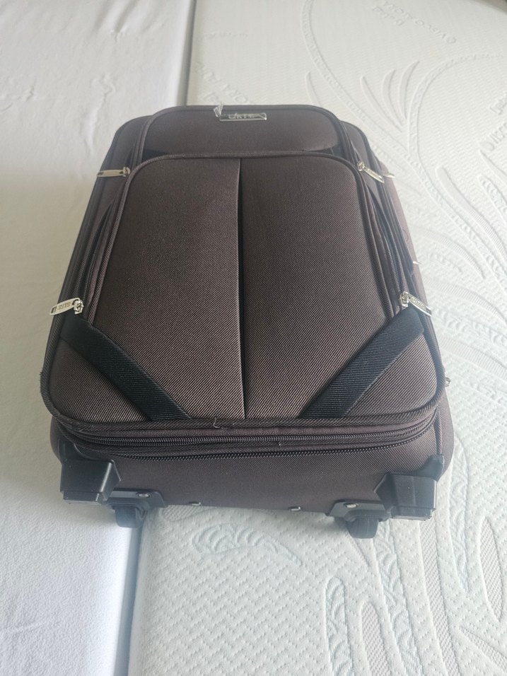 Kahverengi, tokalı kayışlara sahip, iş kullanımına uygun sade ve çağdaş tasarımlı erkek seyahat bavulu. yurtdışı ürün