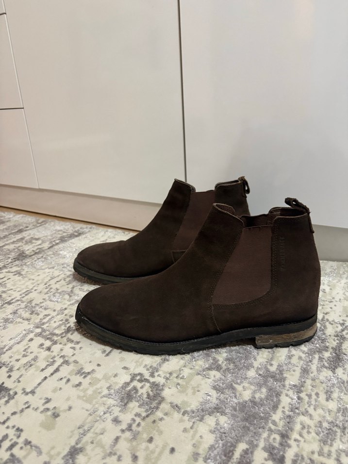 Koyu kahverengi, tokalı erkek botları, sokak giyimi tarzında. Desensiz bu ayakkabılar rahatlık ve şehir modasını birleştirir.