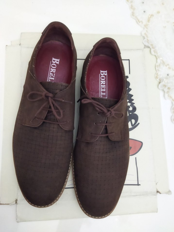 BORELLI marka 45 numara Erkek ayakkabı bir veya iki defa giyildi hiç bir sorunu yok resimde görüldüğü gibi renk koyu kahve rengi ihtiyaç fazlası olduğu için satışa sunuldu taban boyu 32 cm normal kalıp Koyu kahverengi süet erkek klasik ayakkabılar, baskılı desen ve tokalı detaylarla sokak stili ve günlük kullanım için uygun.