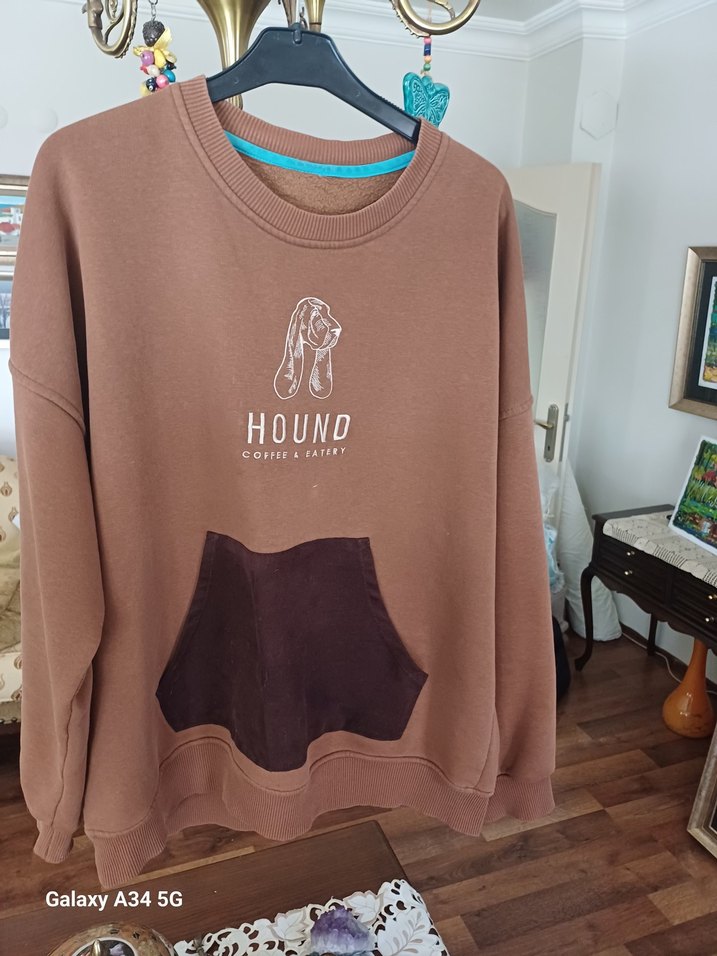 Kahverengi erkek sweatshirt, yuvarlak yaka ve uzun kollu. Bol kesim, detaylı cepli ve baskılı hound deseniyle rahat sokak stili için uygun.ön taraf cep üstünde minik bir çizgi var onun için fiyat düşük tutuldu