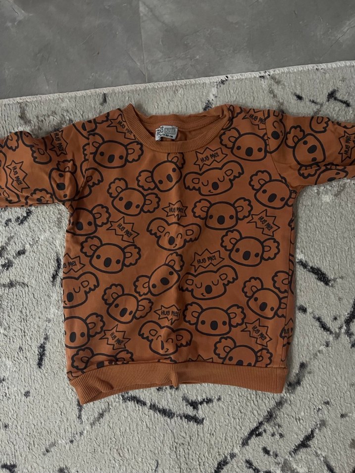 Kahverengi, uzun kollu, yuvarlak yakalı erkek sweatshirt. Baskılı koala desenli, bol kesim ve kürk detaylı, rahat bir sokak stili ürünü.