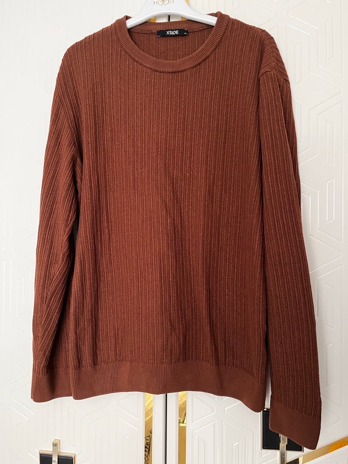 Kahverengi, yumuşak yünden örülmüş, uzun kollu ve bisiklet yaka erkek triko kazak. Rahat kesimiyle günlük sokak stiline uygundur. Yıkandıktan sonra biraz gevşedi