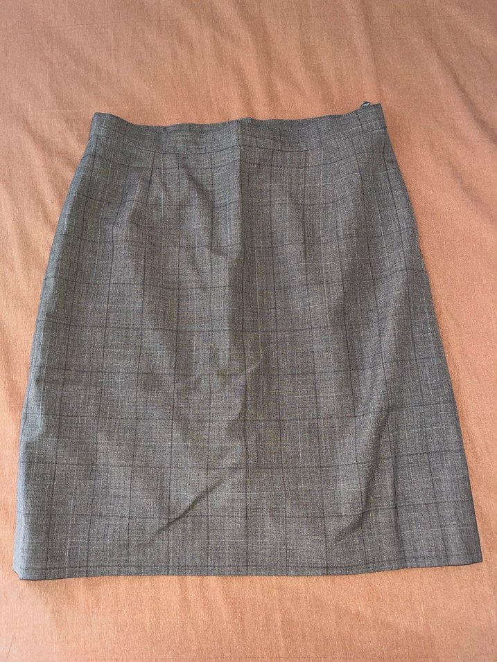 Kahverengi midi kalem etek, sentetik kumaştan, düz ve kareli. Ofis kullanımı için uygun, normal kesim ve sade tasarıma sahiptir.