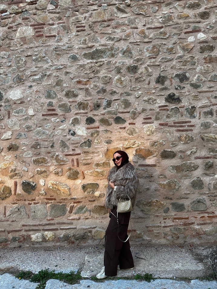 Kahverengi Etnik Desenli Uzun Kürklü Kadın Kaban