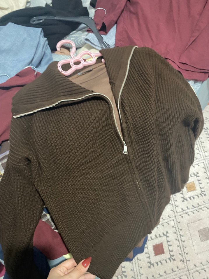 Fermuarlı boğazlı, uzun kollu kahverengi triko kazak, rahat ve sokak stiline uygun, günlük kullanım için ideal.