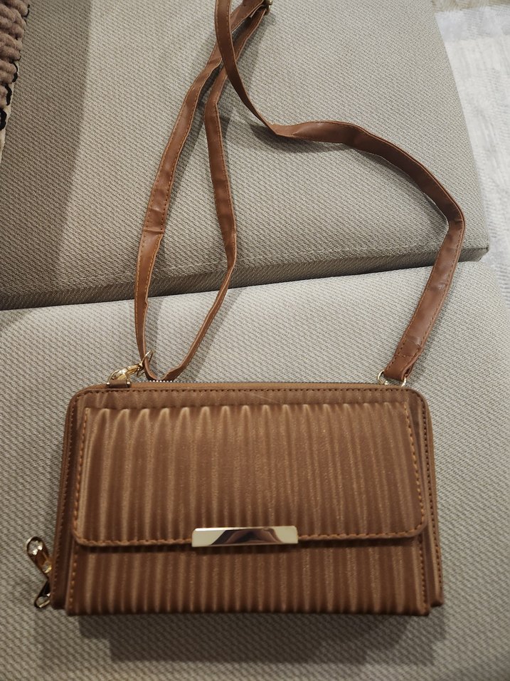 Kahverengi deri, fermuarlı, uzun askılı kadın çantası. Düz yüzeyli, günlük kullanıma uygun.